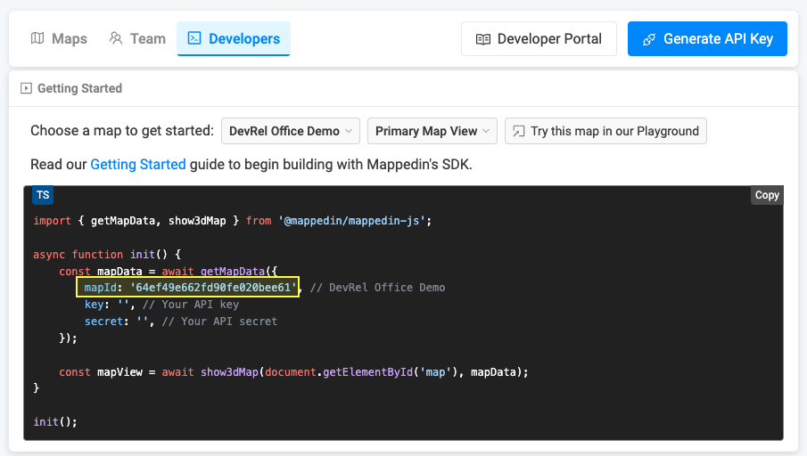 Each map has a unique identifier used by Mappedin JS to load a map. To get the mapId of a map: