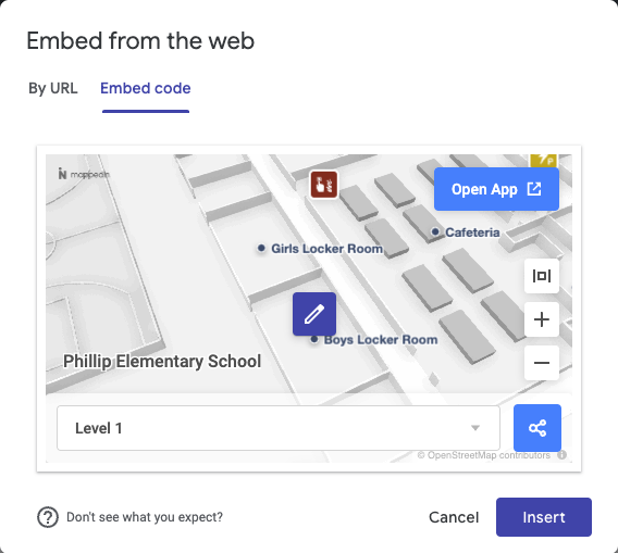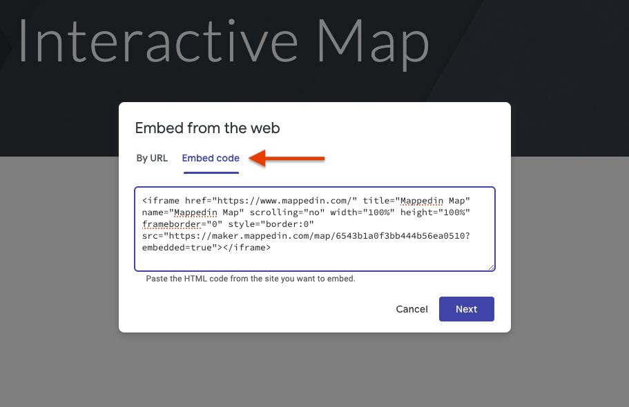 - Paste the embed code copied from Mappedin Maker into the window that appears.